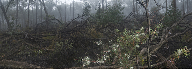 Northern edge of Crocodile Reservoir, July 2019. The flowering local Bushy Needlewood is growing through some of the Box Ironbark trees chopped down for the Ecological Thinning Trial. This 50 year trial by Parks Victoria is an attempt to return the Box-Ironbark Forest to a pre-goldrush state—that is trees of different heights and growth stage instead of the uniform post-goldrush regrowth.