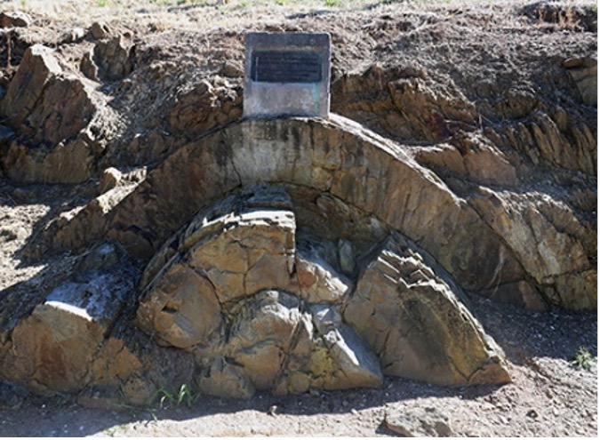 Our geological journey begins on the north side of Lyttleton Street in Castlemaine, some thirty metres to the east of Urquhart Street, where we find an exposure of Ordovician rocks in the steep hillside. There are several geological observations to be made here. The rocks are in distinct layers. Each layer is clearly defined and sits on top of the one below it. Geologists call these layers ‘beds’. The rock beds do not lie flat but form an elegant arch. Sitting on top of the arch is a plaque which assumes that the average reader has a working knowledge of mining geology.