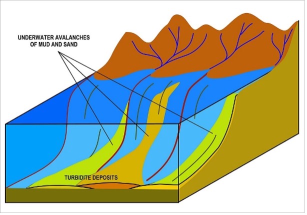 The collapsing and fast-moving sediment is called a turbidity current. Modern turbidity currents travel at more than 60 km/hour and can break submarine cables.