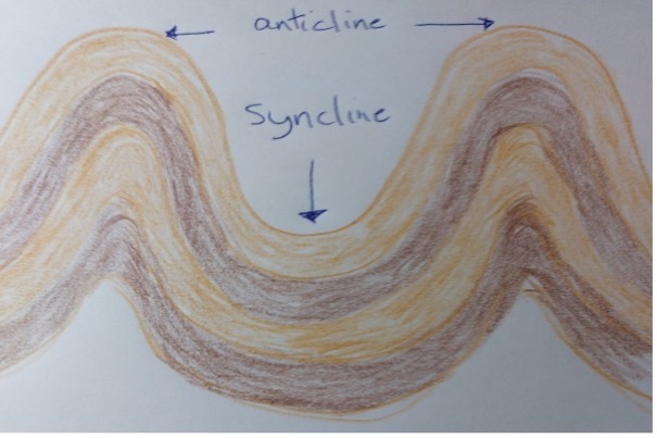 The heading itself holds two key geological terms. To geologists, a fold is a wave or zig-zag shape in rock beds. In our anticlinal fold we note that the beds in the fold sides lie at a steep angle. Anticline is the name geologists give to an upwards fold.
