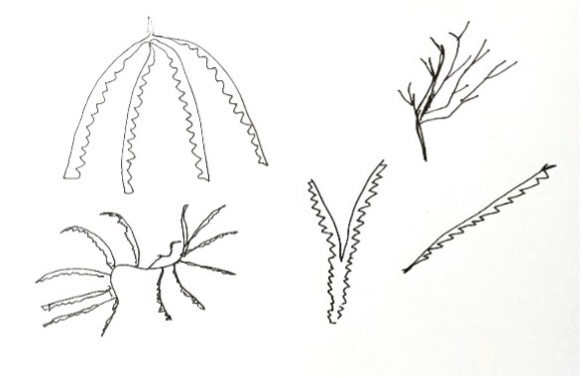 Graptolites were twig-like structures harbouring colonies of minute animals that free-floated in the ocean, feeding on plankton. Graptolites are found worldwide in rocks of Ordovician age. Due to their rapid evolution into a wide variety of different forms, they have proved to be very valuable tools for determining the relative ages of rocks, and for identifying rocks of similar age in different locations