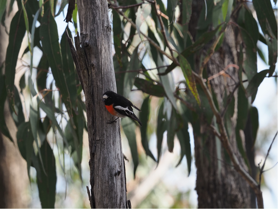 Scarlet Robin perched on the trunk of a Long-leaved Box. Photo Stanislaw Wawrzyczek