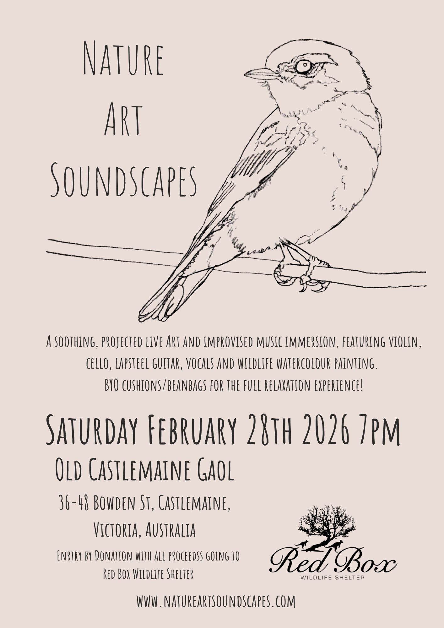 - Nature Art Soundscapes performance fundraiser for Red Box Wildlife Shelter; 7pm on Saturday 28th February @ Old Castlemaine Jail. 9 February, 2026