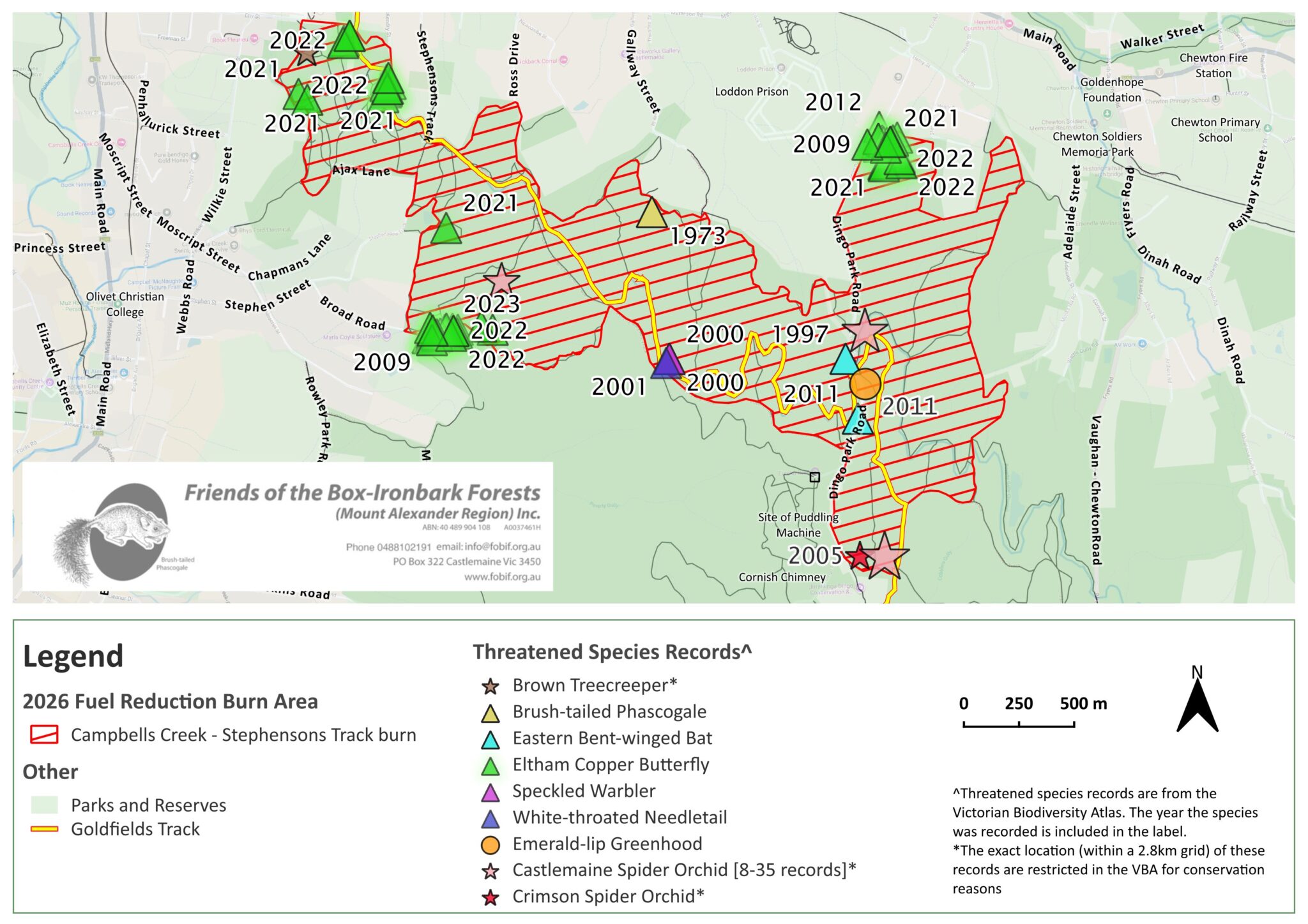 FOBIF has lodged a submission to Forest Fire Management Victoria (FFMV) regarding the proposed 239-hectare Campbells Creek – Stephensons Track planned burn in the Castlemaine Diggings National Heritage Park.